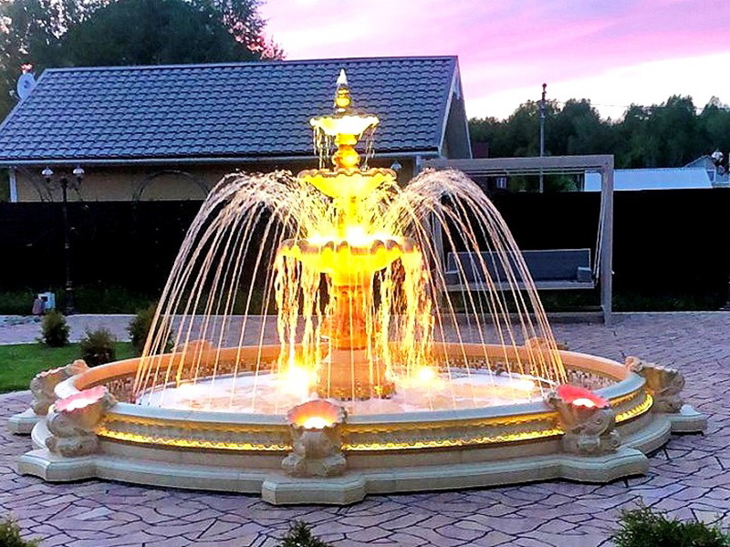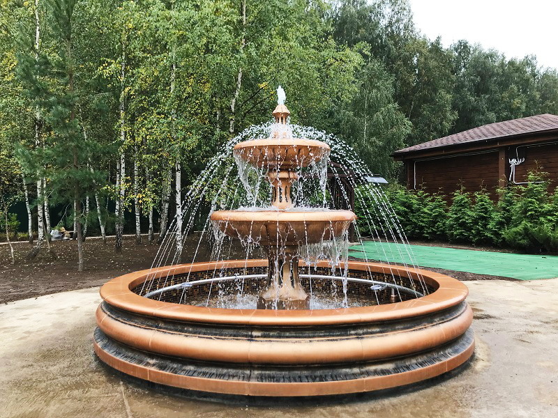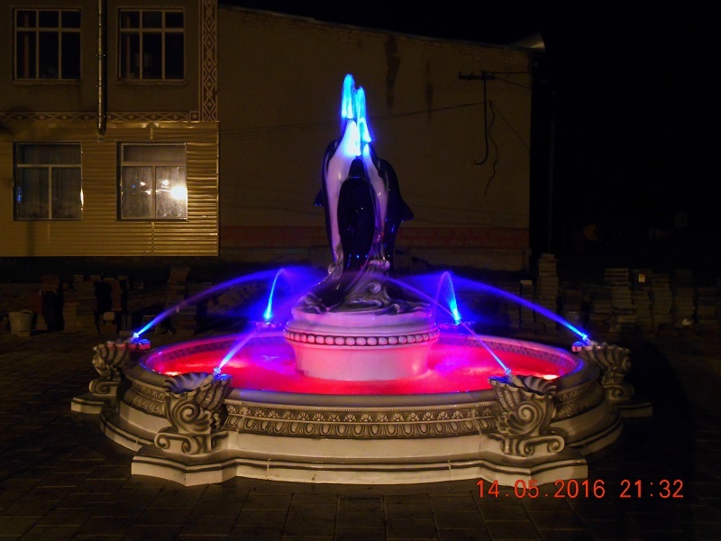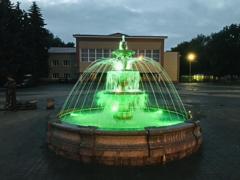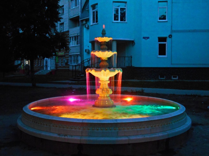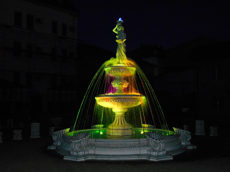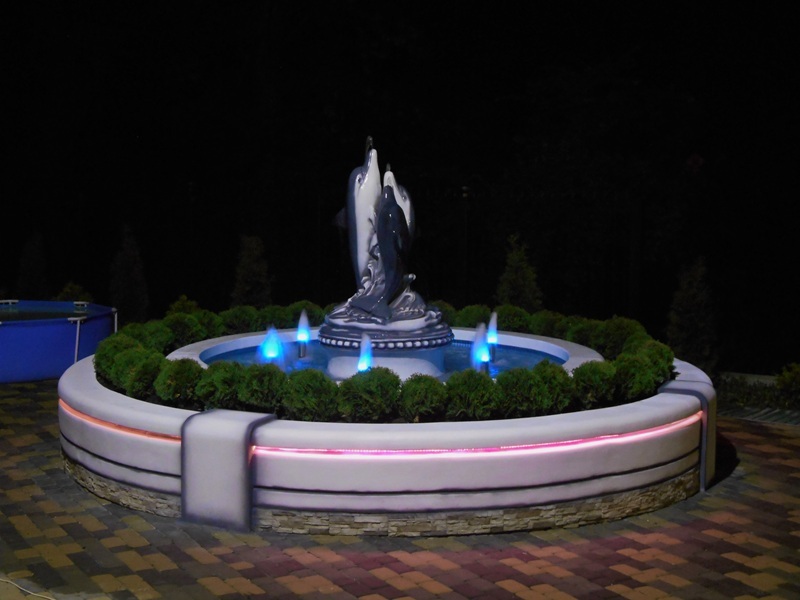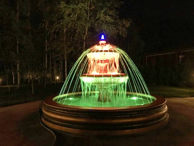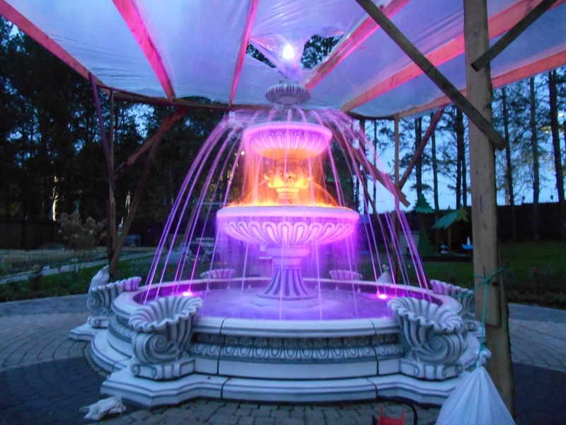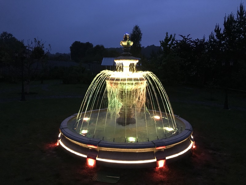 Данная модель фонтана, как и все существующие модели сборных фонтанов, собирается на готовой фундаментной плите из отдельных частей, блоков, изготовленных на заводе из бетона. Производитель добавляет в бетон цветной пигмент, который придаёт нужный цвет фонтану и таким образом, фонтан можно не красить. В нашем случае, мы произвели полный окрас фонтана после его сборки с целью придания фонтану уникального эстетичного вида. Дополнительно, для создания уникальной водной картины, мы установили фонтанное оборудование, в виде фонтанного кольца и произвели максимальную подачу потока воды в чаши фонтана. На фото видно, что с чаши фонтана спадает интенсивный поток воды, образуя сплошную водную штору. Также видно, что в бассейне фонтана, по кругу, вдоль борта, установлены белые пластиковые трубы, на окончания которых накручены струйные фонтанные насадки. Это один из вариантов установки в фонтане сборного фонтанного кольца из пластиковых труб. Само кольцо в этом варианте установлено внутри бетона на стадии выполнения фундаментных работ. Весь трубопровод, при этом, установлен с необходимыми уклонами, что упрощает эксплуатацию фонтана и позволяет во время зимней консервации фонтана не использовать продувку трубопроводов воздухом. По фото, так же, видно, что на внешней стороне борта фонтана и в брусчатке установлена дополнительная подсветка в виде светодиодной ленты и влагозащищённых светильников. Такую подсветку мы устанавливаем во время строительства фонтана и при выполнении работ по реконструкции фонтанов. Подобный фонтан, прежде всего, представляет собой достаточно сложное гидротехническое сооружение и при расчёте стоимости монтажных работ учитывается большое количество различных нюансов и составляющих, и это не только технические данные. На стоимость выполняемых работ, могут повлиять следующие факторы: - Это погодные условия, индивидуальные особенности местности, наличие различных факторов, усложняющих работы, или влияющих на сроки проведения работ и мн.др.