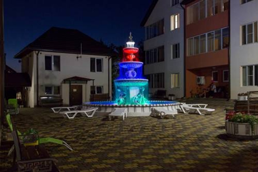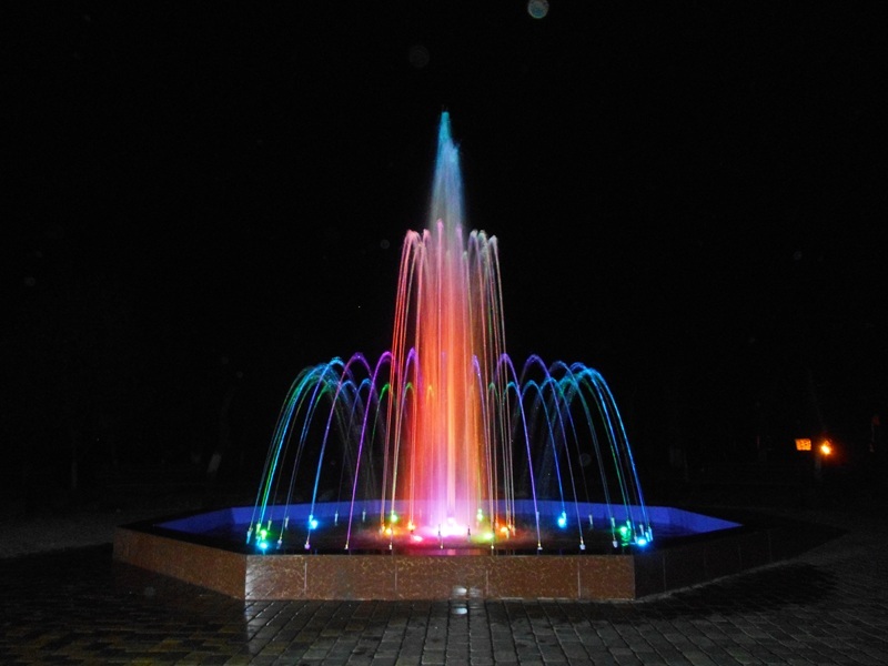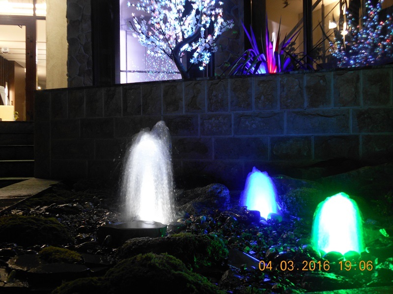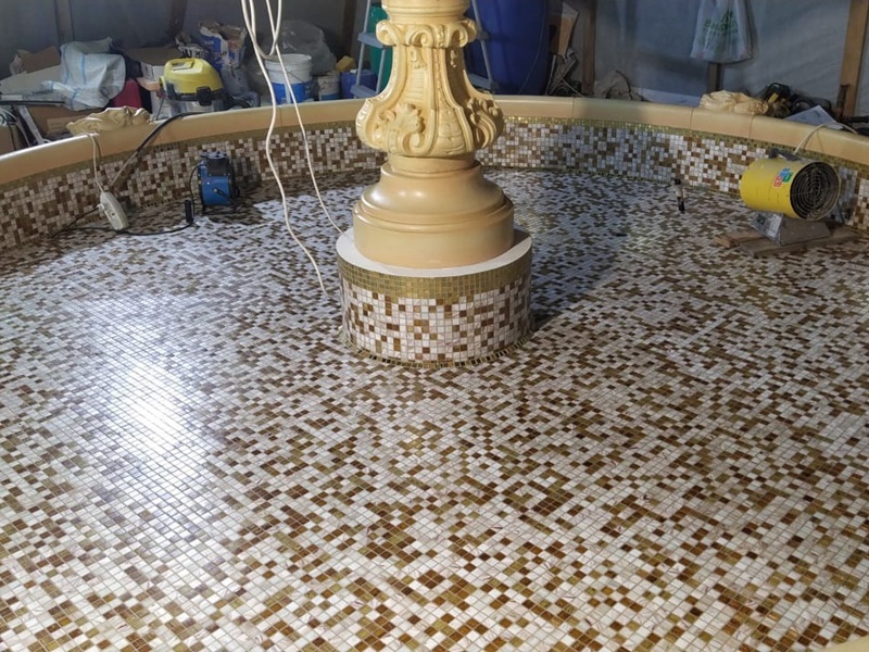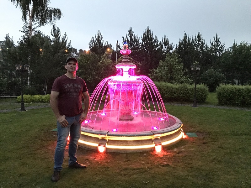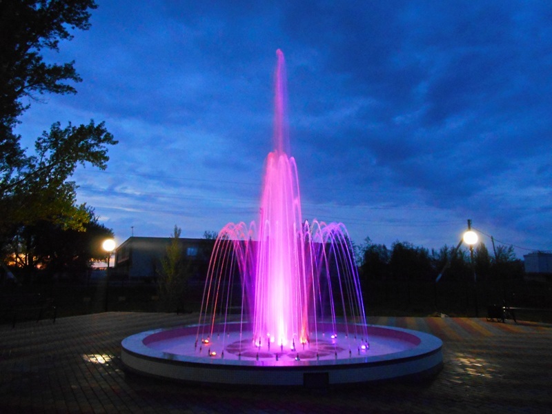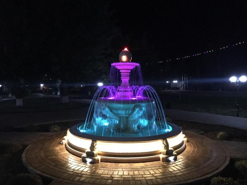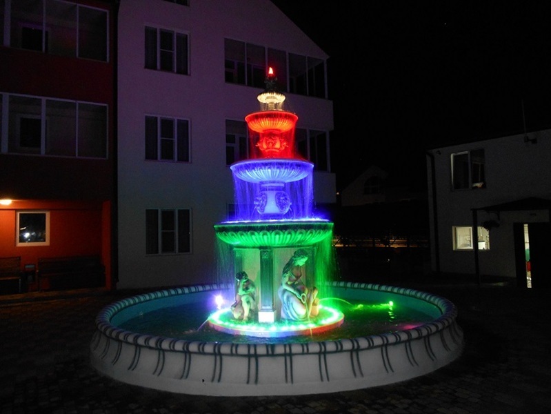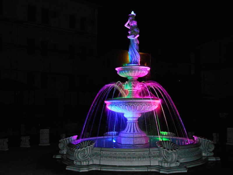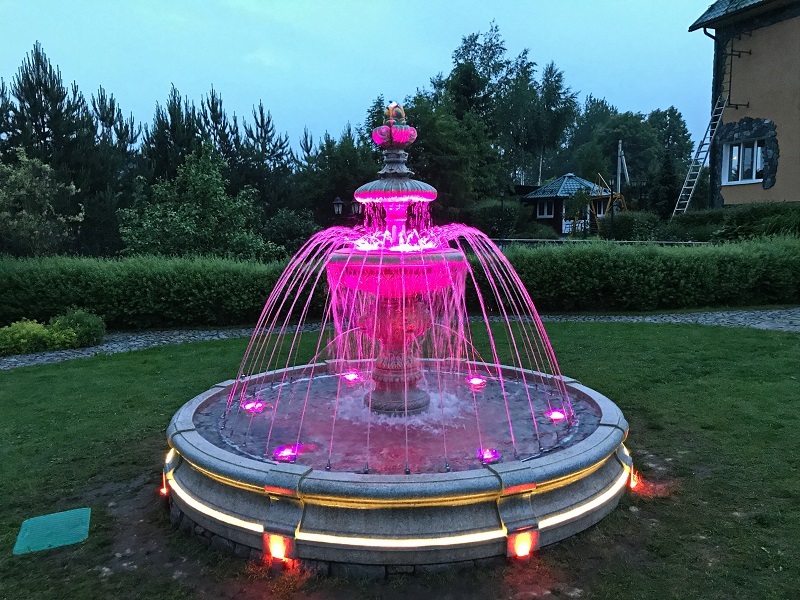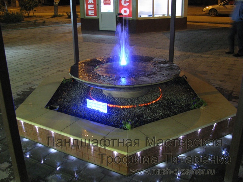 Данная модель фонтана, как и все существующие модели сборных фонтанов, собирается на готовой фундаментной плите из отдельных частей, блоков, изготовленных на заводе из бетона. Производитель добавляет в бетон цветной пигмент, который придаёт нужный цвет фонтану и таким образом, фонтан можно не красить. В нашем случае, мы произвели полный окрас фонтана после его сборки с целью придания фонтану уникального эстетичного вида. Дополнительно, для создания уникальной водной картины, мы установили фонтанное оборудование, в виде фонтанного кольца и произвели максимальную подачу потока воды в чаши фонтана. На фото видно, что с чаши фонтана спадает интенсивный поток воды, образуя сплошную водную штору. Также видно, что в бассейне фонтана, по кругу, вдоль борта, установлены белые пластиковые трубы, на окончания которых накручены струйные фонтанные насадки. Это один из вариантов установки в фонтане сборного фонтанного кольца из пластиковых труб. Само кольцо в этом варианте установлено внутри бетона на стадии выполнения фундаментных работ. Весь трубопровод, при этом, установлен с необходимыми уклонами, что упрощает эксплуатацию фонтана и позволяет во время зимней консервации фонтана не использовать продувку трубопроводов воздухом. По фото, так же, видно, что на внешней стороне борта фонтана и в брусчатке установлена дополнительная подсветка в виде светодиодной ленты и влагозащищённых светильников. Такую подсветку мы устанавливаем во время строительства фонтана и при выполнении работ по реконструкции фонтанов. Подобный фонтан, прежде всего, представляет собой достаточно сложное гидротехническое сооружение и при расчёте стоимости монтажных работ учитывается большое количество различных нюансов и составляющих, и это не только технические данные. На стоимость выполняемых работ, могут повлиять следующие факторы: - Это погодные условия, индивидуальные особенности местности, наличие различных факторов, усложняющих работы, или влияющих на сроки проведения работ и мн.др.