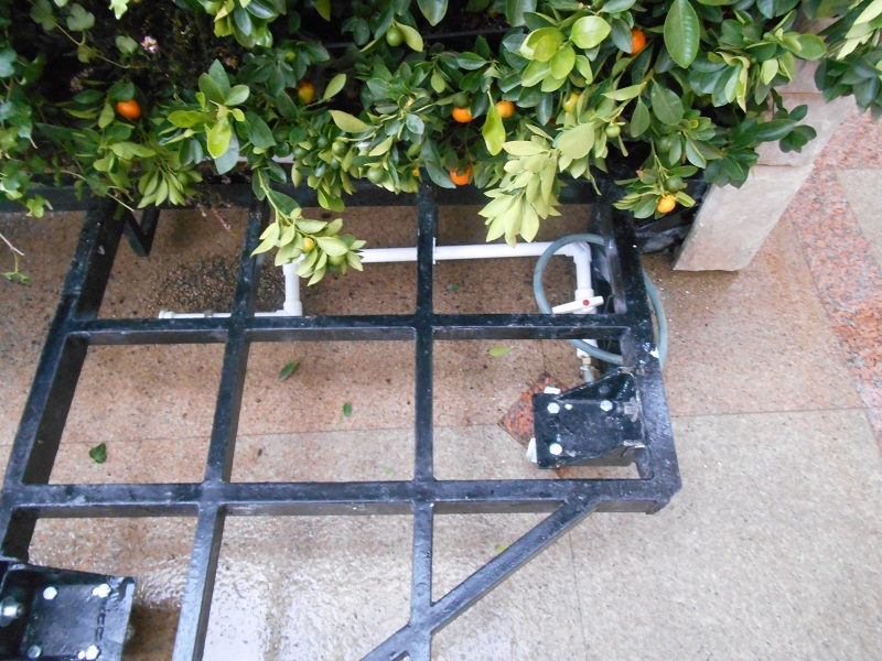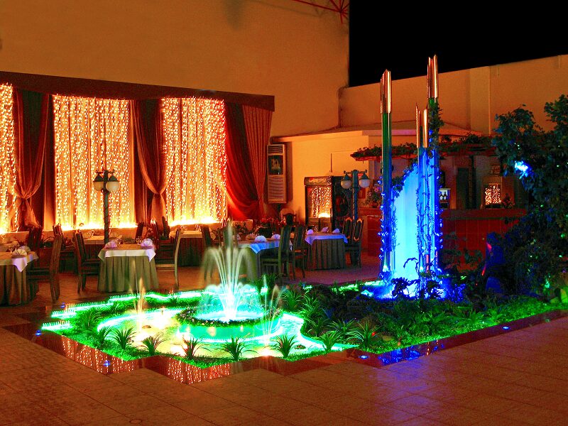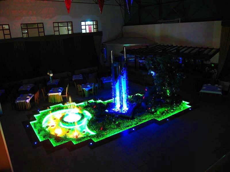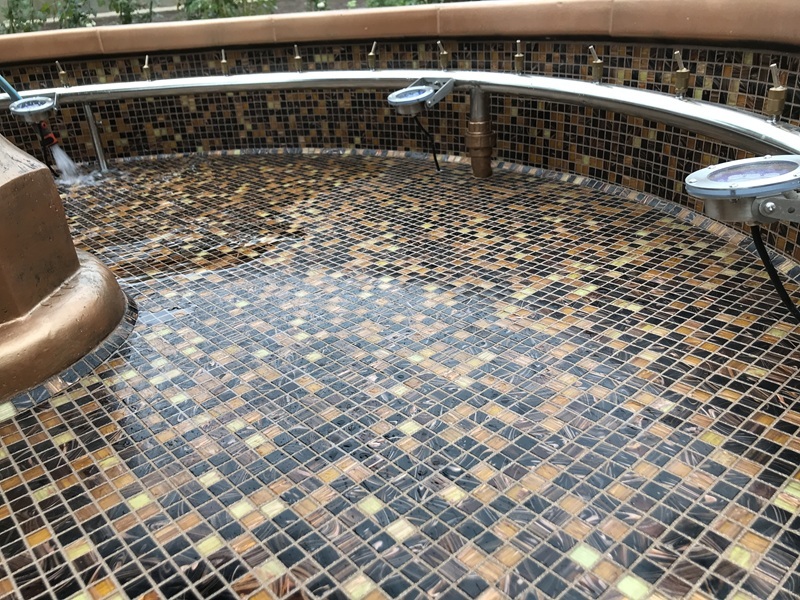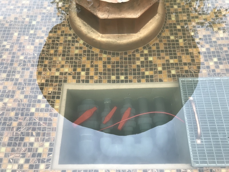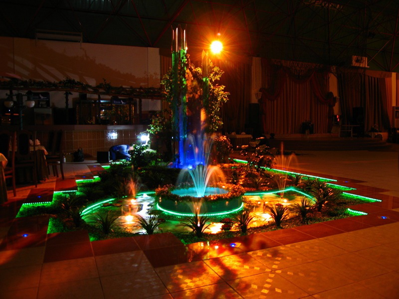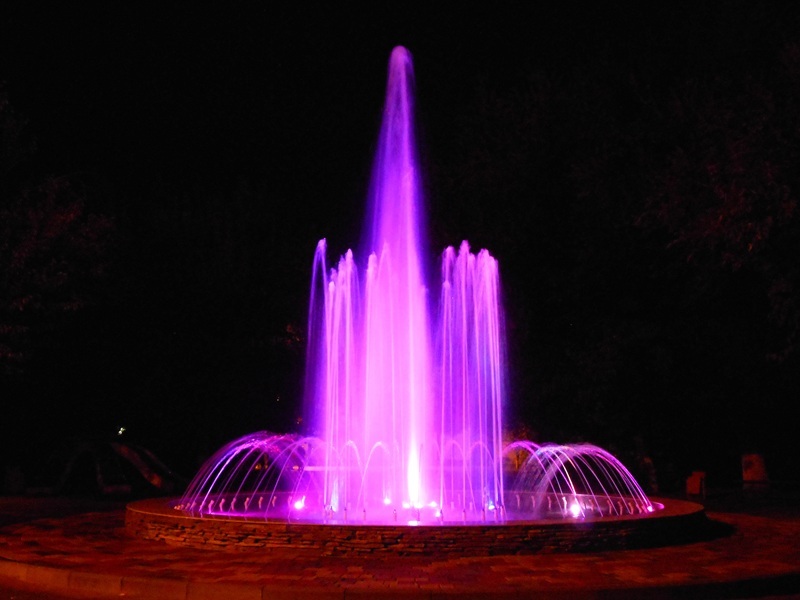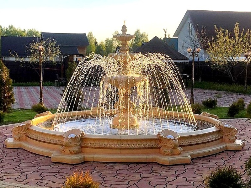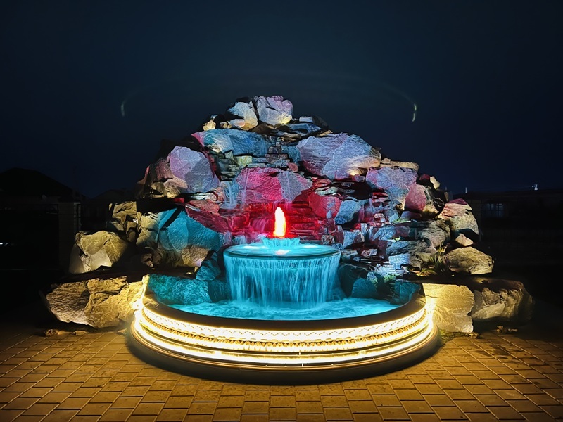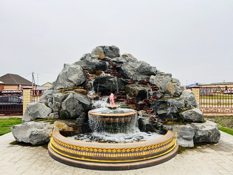 Данная модель фонтана, как и все существующие модели сборных фонтанов, собирается на готовой фундаментной плите из отдельных частей, блоков, изготовленных на заводе из бетона. Производитель добавляет в бетон цветной пигмент, который придаёт нужный цвет фонтану и таким образом, фонтан можно не красить. В нашем случае, мы произвели полный окрас фонтана после его сборки с целью придания фонтану уникального эстетичного вида. Дополнительно, для создания уникальной водной картины, мы установили фонтанное оборудование, в виде фонтанного кольца и произвели максимальную подачу потока воды в чаши фонтана. На фото видно, что с чаши фонтана спадает интенсивный поток воды, образуя сплошную водную штору. Также видно, что в бассейне фонтана, по кругу, вдоль борта, установлены белые пластиковые трубы, на окончания которых накручены струйные фонтанные насадки. Это один из вариантов установки в фонтане сборного фонтанного кольца из пластиковых труб. Само кольцо в этом варианте установлено внутри бетона на стадии выполнения фундаментных работ. Весь трубопровод, при этом, установлен с необходимыми уклонами, что упрощает эксплуатацию фонтана и позволяет во время зимней консервации фонтана не использовать продувку трубопроводов воздухом. По фото, так же, видно, что на внешней стороне борта фонтана и в брусчатке установлена дополнительная подсветка в виде светодиодной ленты и влагозащищённых светильников. Такую подсветку мы устанавливаем во время строительства фонтана и при выполнении работ по реконструкции фонтанов. Подобный фонтан, прежде всего, представляет собой достаточно сложное гидротехническое сооружение и при расчёте стоимости монтажных работ учитывается большое количество различных нюансов и составляющих, и это не только технические данные. На стоимость выполняемых работ, могут повлиять следующие факторы: - Это погодные условия, индивидуальные особенности местности, наличие различных факторов, усложняющих работы, или влияющих на сроки проведения работ и мн.др.